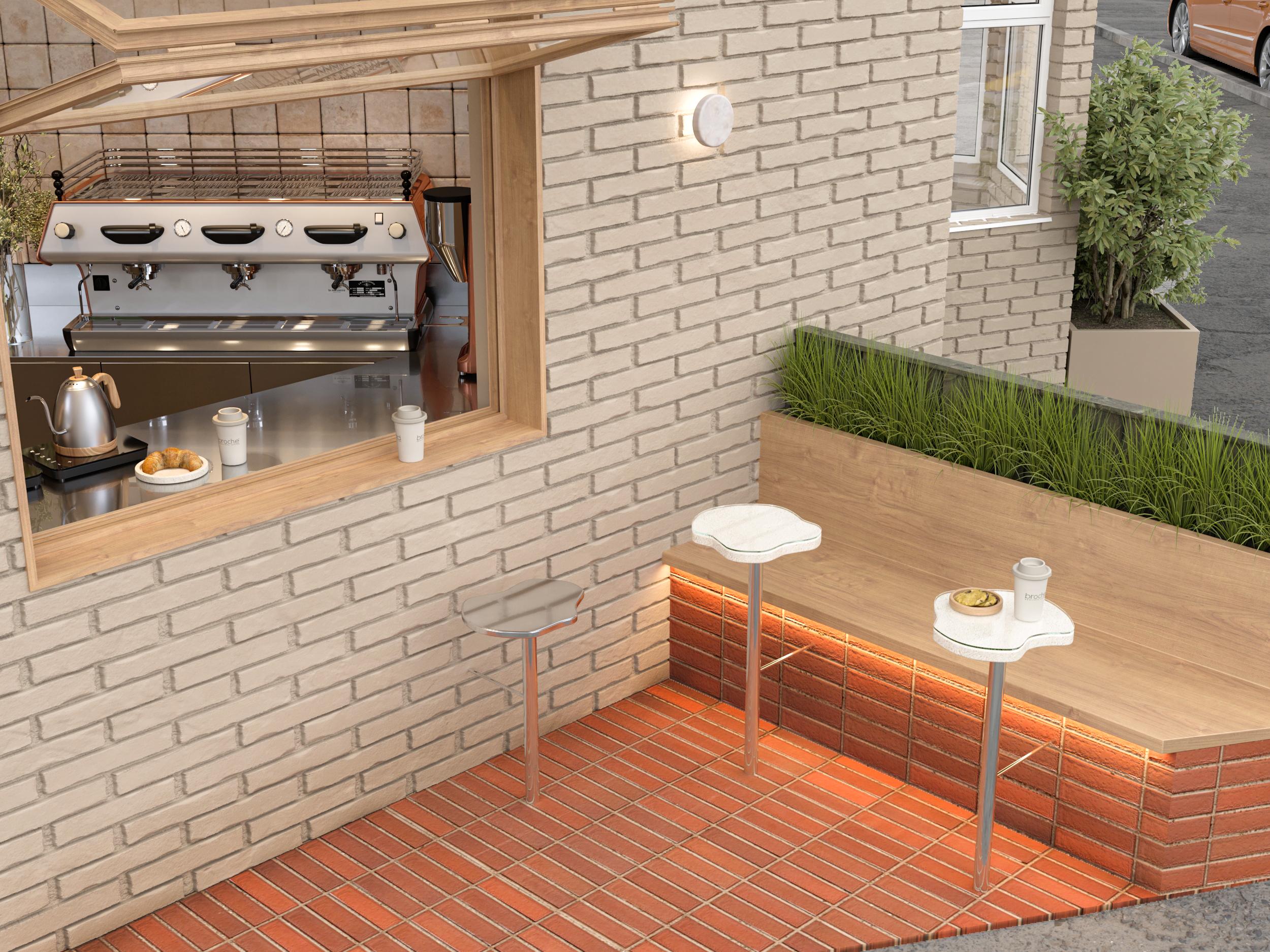 In the building itself, due to its status as a historic district, we didn't have much opportunity to change anything - but we still managed to revitalize it. We replaced the windows with sliding wooden ones, with beautiful casing, so that it would be convenient to serve customers take away. A few square meters in front of the coffee shop, which are adjacent to it we laid out with clinker tiles, placed benches and three cozy tables on it.
